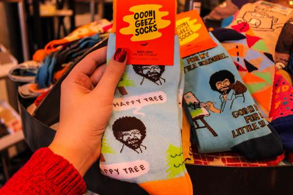 What could possibly be cooler than BOB ROSS SOCKS? The answer is nothing. If you know anyone who loves novelty socks, likes to paint, enjoys happy trees, or who just needs an extra Christmas smile, you can snag these socks for them (or yourself) at Fete-ish.