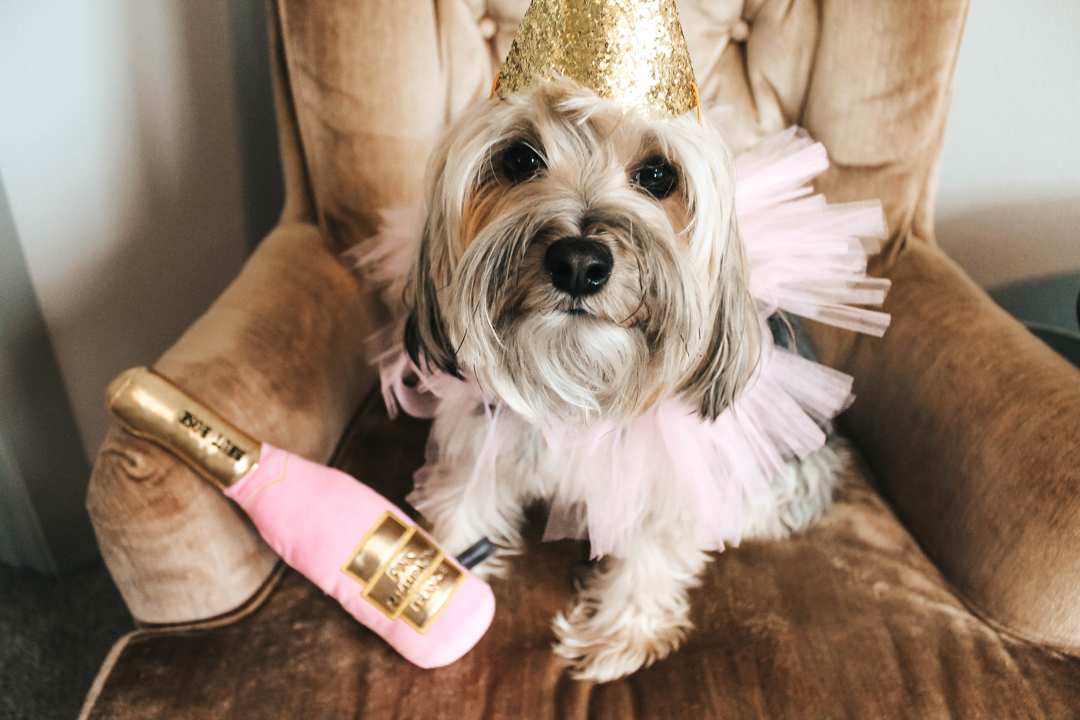 Last but not least, give your dog a birthday present. Spring for a new collar, new bed, or new toy at your local pet store. I found Lucy a rosé squeaky toy on Amazon so she could toast to turning 21! It’s now her favorite toy in the house, and watching her carry a bottle of rosé around in her mouth never fails to crack me up.